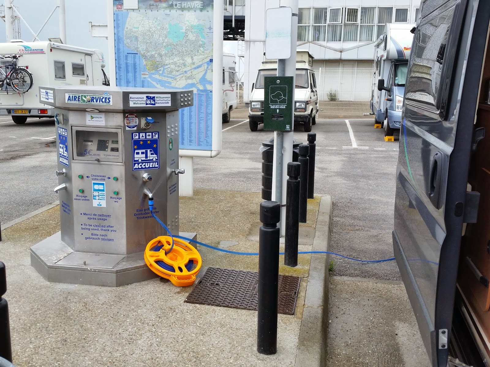 Am frühen Nachmittag erreichen wir Le Havre, eine riesige Hafenstadt. Da unserer WoMo mal etwas Pflege bedarf, laufen wir den örtlichen Stellplatz an und entleeren die Toilette und ziehen neues